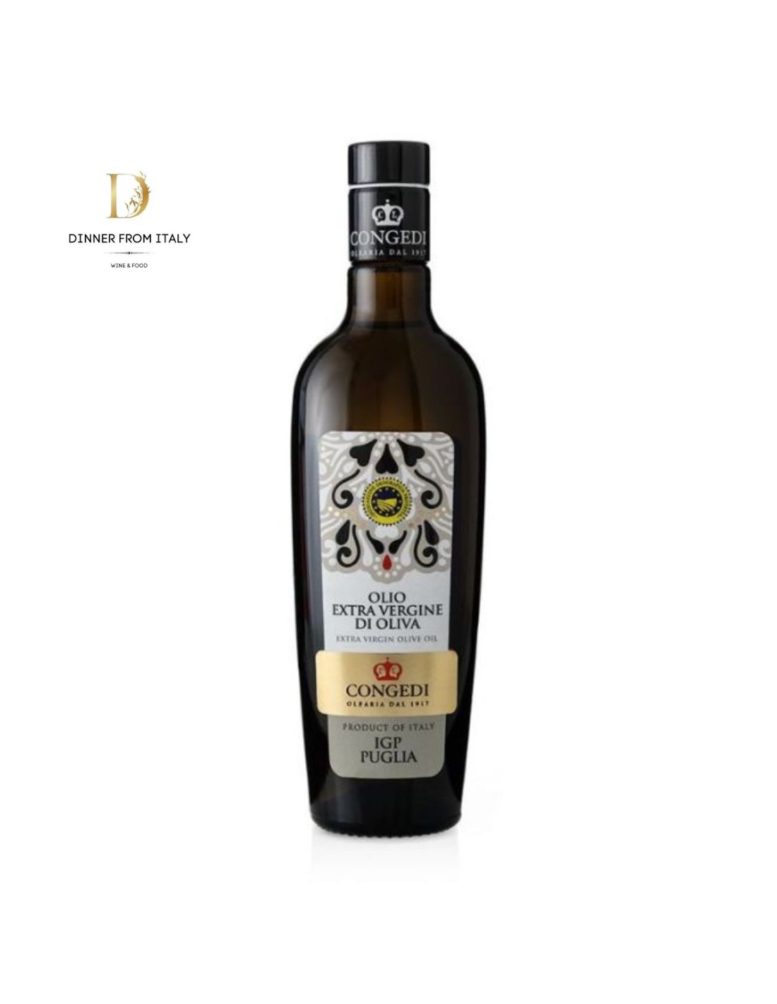 Olio extravergine di oliva Puglia IGP Congedi è un olio extravergine estratto a freddo e deriva da un'attenta selezione delle olive che la famiglia Congedi effettua ogni anno. Le olive sono della varietà Frantoio, raccolta in ottobre a perfetta maturazione così da ottenere sapori e profumi molto equilibrati.