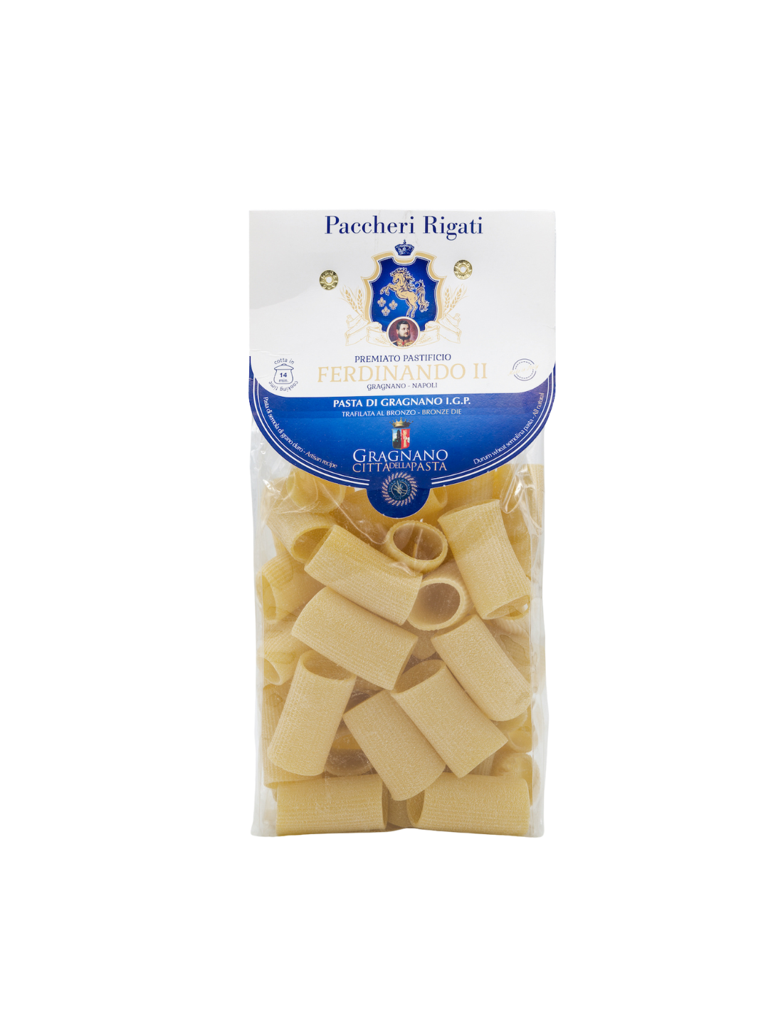 Paccheri Rigati Gragnano PGI Pasta produced by the award-winning Pastificio Ferdinando II with durum wheat semolina.