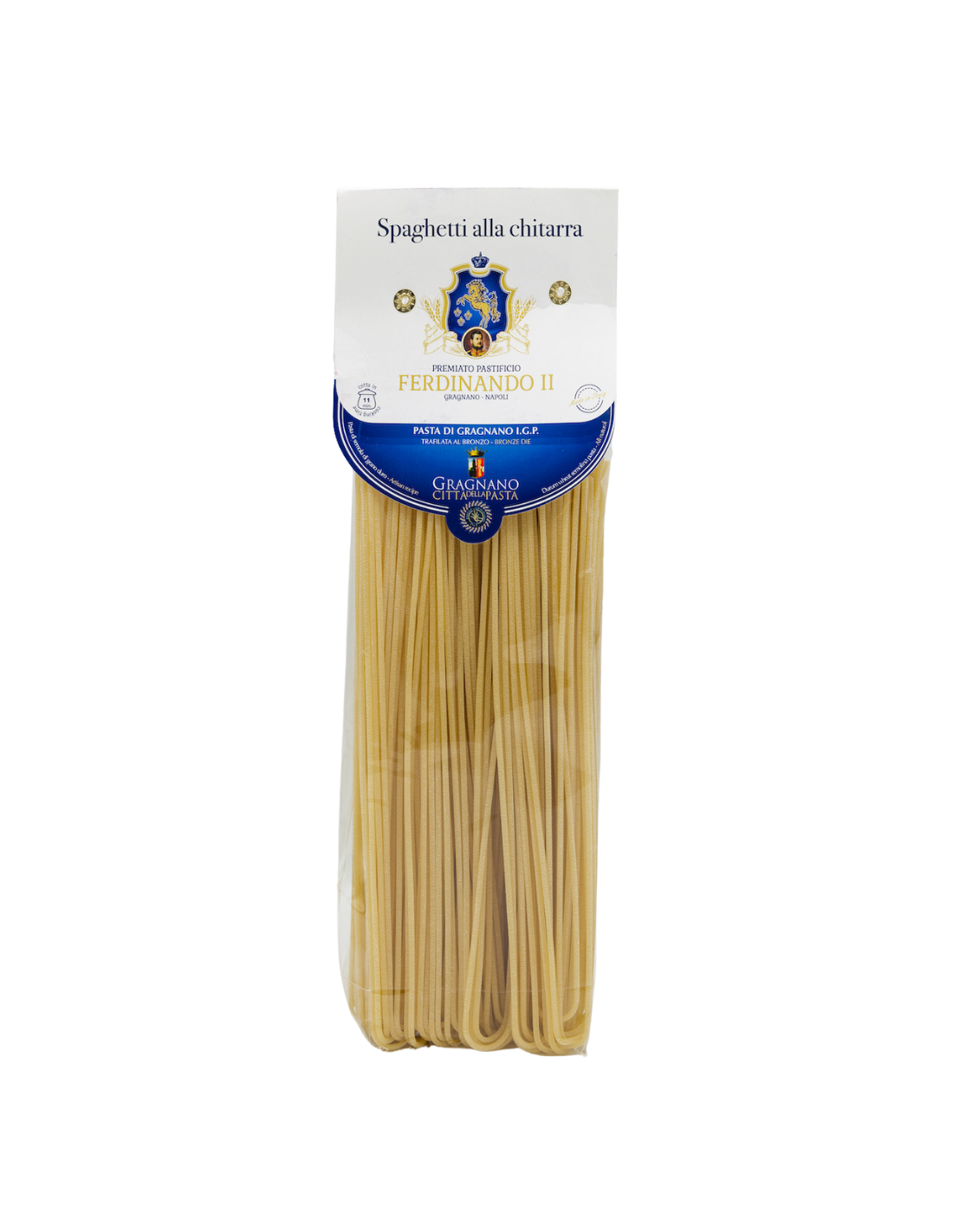 Spaghetti alla Chitarra Pasta di Gragnano I.G.P. prodotti da Premiato Pastificio Ferdinando II con semola di grano duro. Realizzato secondo il rigoroso disciplinare di produzione I.G.P. con grano 100% italiano in sacchi e dalle migliori coltivazioni, la pasta di Gragnano rappresenta la tradizione dei maestri pastai italiani. Una volta scelti gli ingredienti, il mastro pastaio setaccia la semola di grano duro per verificare la purezza del prodotto prima di iniziare la produzione. La trafilatura al bronzo e la lenta essiccazione donano alla pasta quella particolare ruvidità, che permette una perfetta unione con il condimento. Essiccata in celle statiche a bassa temperatura per almeno 24 ore, al fine di preservare la qualità e il gusto del prodotto.