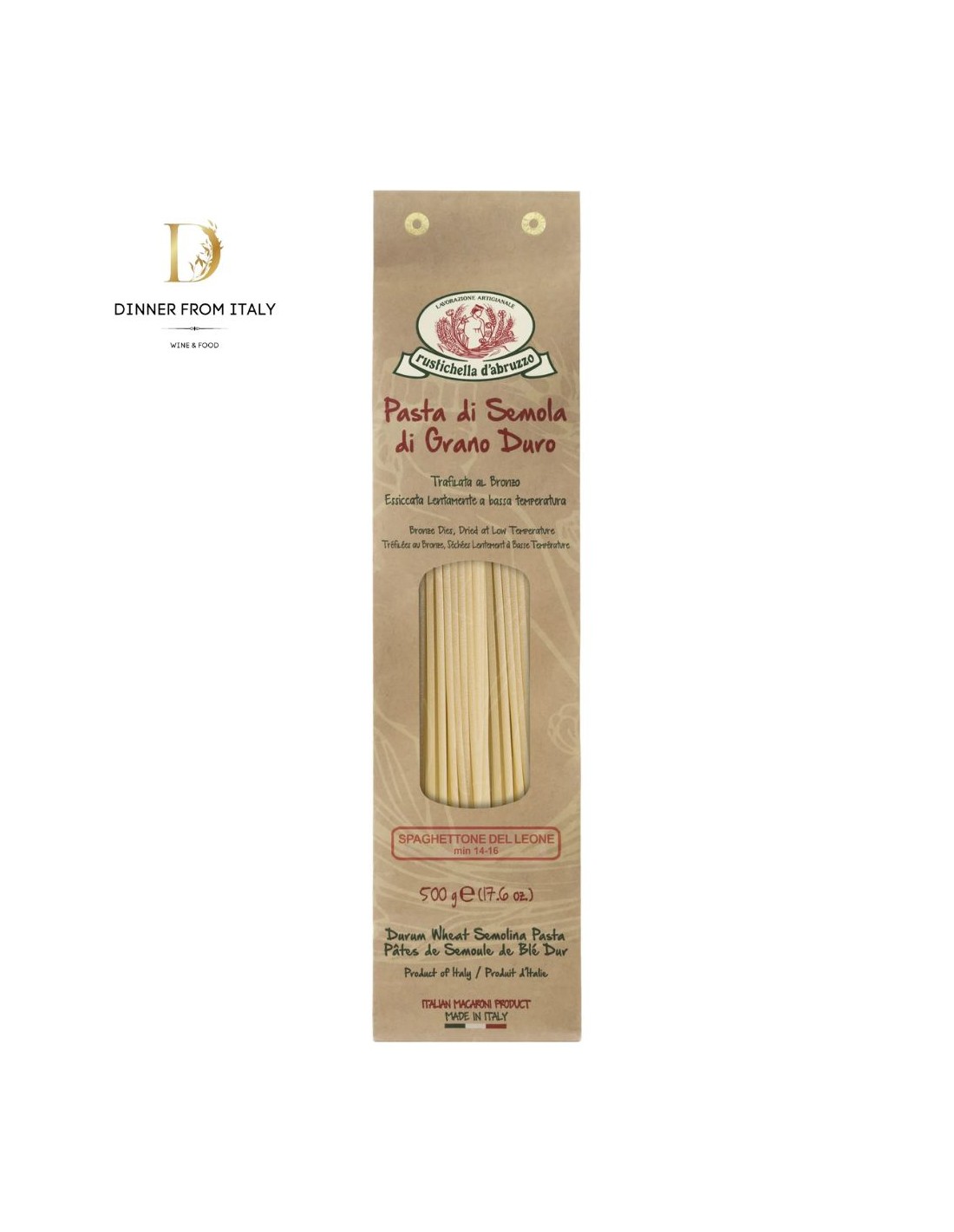Formato esclusivo di Rustichella d’Abruzzo realizzato con le migliori selezioni di grano duro, lo “Spaghettone del Leone” presenta una sezione circolare di 2.6 mm, è trafilato in bronzo ed essiccato a bassa temperatura. Uno spaghetto più corposo e più spesso rispetto a quello classico e allo spaghettone PrimoGrano, che vuole soddisfare anche i palati più esigenti.
