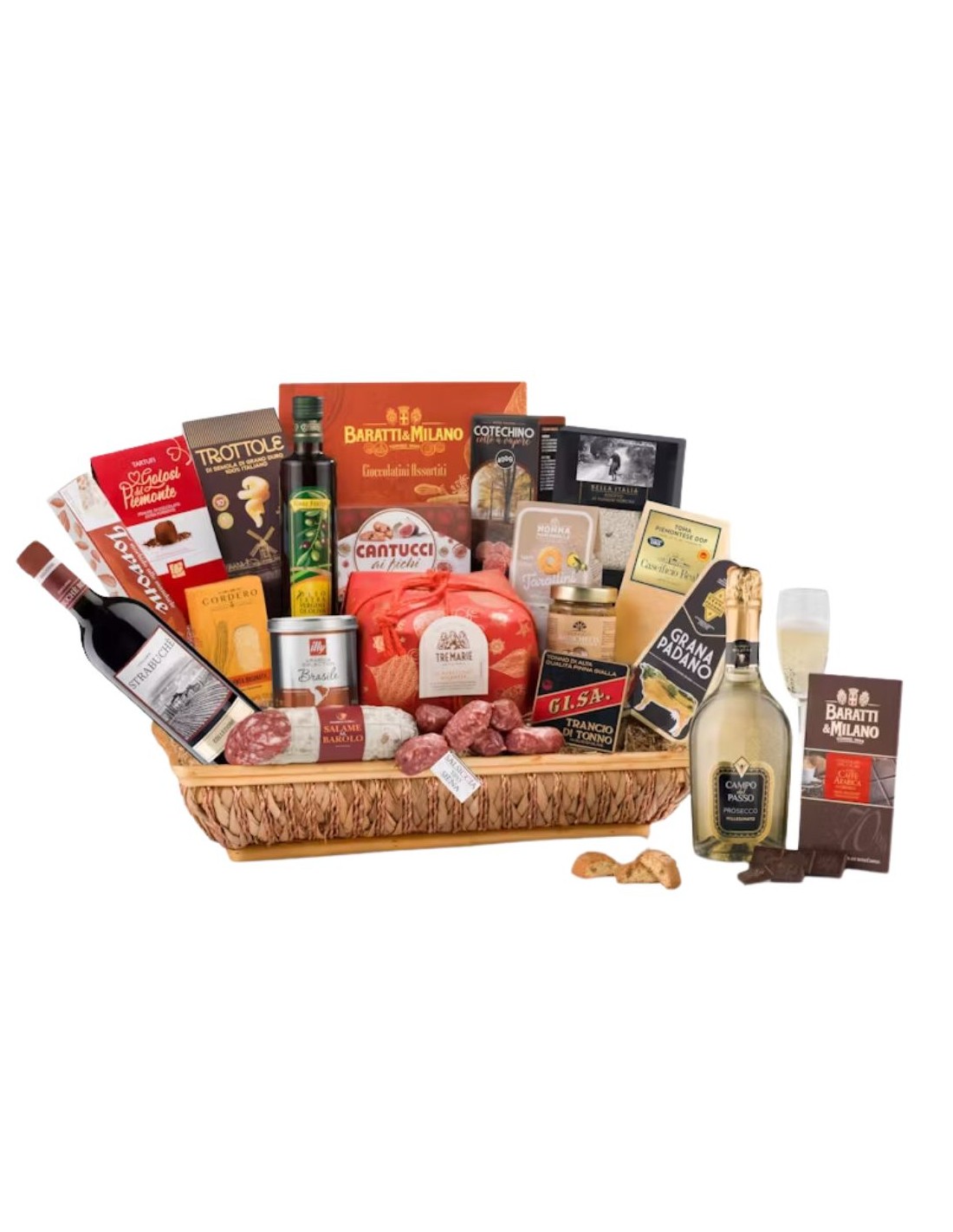 Cestone portatutto con manici. Panettone Classico Milanese, incartato a mano ;Tre Marie, g 750. Bottiglia Prosecco DOC Extra Dry Millesimato ;Campo del Passo, ml 750. Bottiglia Strabuchè ;Collezione Collarin, ml 750. Salsiccia tipo Siena Puro Suino ;Salumificio Viani, g 200 ca. Scatola Cotechino cotto al vapore ;Salumificio Vecchi, g 400. Trancio Grana Padano DOP ;Virgilio, g 150. Grana Padano DOP ;Virgilio, g 150. Bottiglia Olio Extra Vergine di Oliva ;Terre Fertili, ml 250. Specialità Salame al Barolo ;Salumificio Gonella, g 100 ca. Trancio di Tonno Yellowfin in Olio di Oliva ;Gi.Sa., g 160. Confezione Trottole, Pasta 100% Italiana preparata con trafila ruvida ;Cruset, g 250. Vaso Bruschetta con Porcini e Finferli ;Saporie, g 185. Confezione Tartufi Praline di Cioccolato Extra Fondente ;Golosi del Piemonte, g 75. Tavoletta Cioccolato Extra Fondente con granella di Caffè Arabica ;Baratti & Milano, g 75. Confezione Tarallini con Olio Extra Vergine di Oliva ;Nonna Mariangela, g 100. Stecca Torrone Morbido alle Mandorle ;Crispiani, g 80. Lattina Caffè Macinato Monoarabica ;Illycaffè, g 125. Confezione Cioccolatini Assortiti ;Baratti & Milano, g 250. Astuccio Risotto ai Funghi Porcini ;Bella Italia, g 200. Astuccio Cantucci ai Fichi ;L’Albereto, g 80. Confezione Polenta Bramata ;Cordero, g 225.