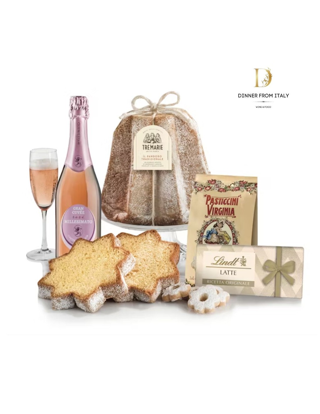 Elegante scatola regalo litografata. Pandoro Classico Milanese ;Tre Marie, g 750. Bottiglia Spumante Gran Cuvée Rosé Millesimato 2023 ;Cantine Collarin, ml 750. Confezione Deliziosi Canestrelli, Specialità del Sassello ;Amaretti Virginia, g 80. Tavoletta Cioccolato al Latte ;Lindt, g 100.