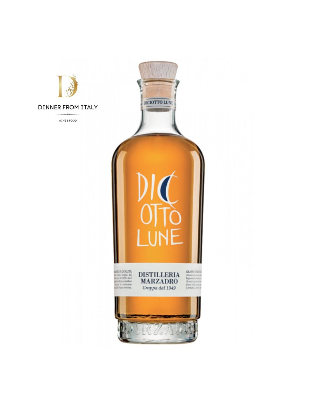 Grappa stravecchia Le Diciotto Lune Marzadro è un’acquavite di vinaccia ottenuta dalla distillazione di alcune tra le varietà più note del Trentino: Merlot, Marzemino, Teroldego, Chardonnay e Moscato, invecchiata per ben 18 lune, un anno e mezzo circa, regala aromi intensi, eterei ed eleganti.