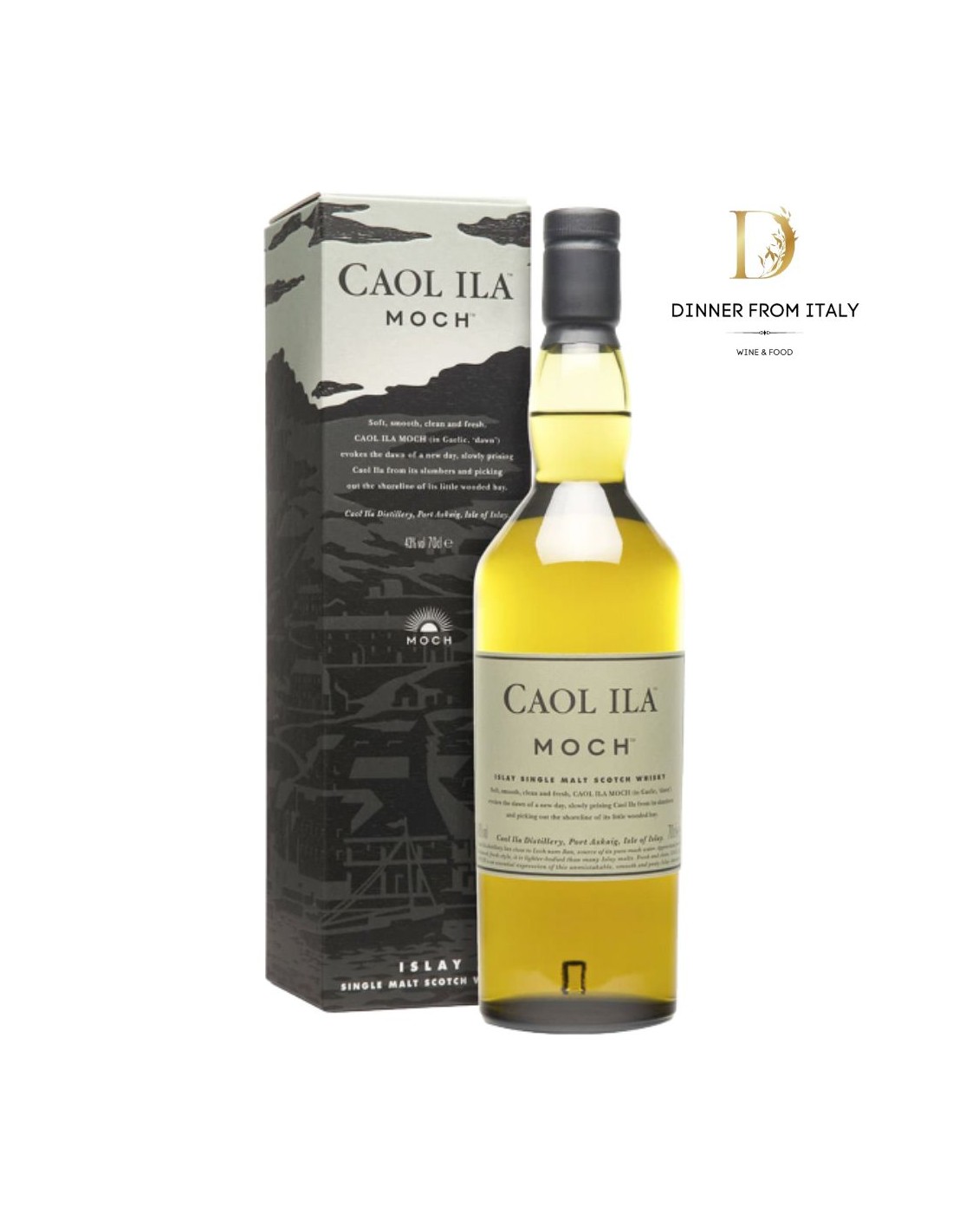 Caol Ila Mochè è un Single Malt di altissima qualità. Il Moch, che deriva dal Gaelico e tradotto letteralmente significa "Alba", è così chiamato perchè inteso come un punto di partenza: imbottigliato senza dichiarazioni di età, prodotto da puro malto d'orzo, torbato, questo Whiksy stupisce per la delicatezza dei profumi e per il gusto corposo. Un punto di riferimento per la sua categoria.