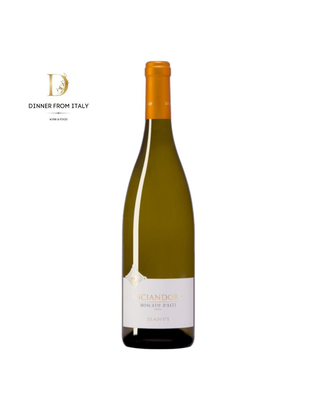 Moscato D'Asti Sciandor di Banfi, alla degustazione si present acon il colore paglierino tenue, profuma di uva spina e mughetto, pesca bianca, salvia e miele d’acacia. All’assaggio è pienamente corrispondente all’olfattiva, è morbido ma ben sorretto da delicata acidità e chiude con persistenza dai rimandi floreali.