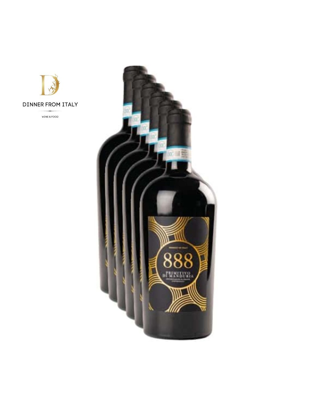 Primitivo di Manduria DOC 888 displays an intense ruby red color with purple highlights. The nose opens with a rich and enveloping bouquet, featuring notes of ripe fruit, such as plum, blackberry, and cherry, accompanied by hints of sweet spices, cocoa, and vanilla. On the palate, it is full-bodied and velvety, with soft tannins and a pleasant sweetness. The finish is long and persistent, with a return of fruity and spicy notes.