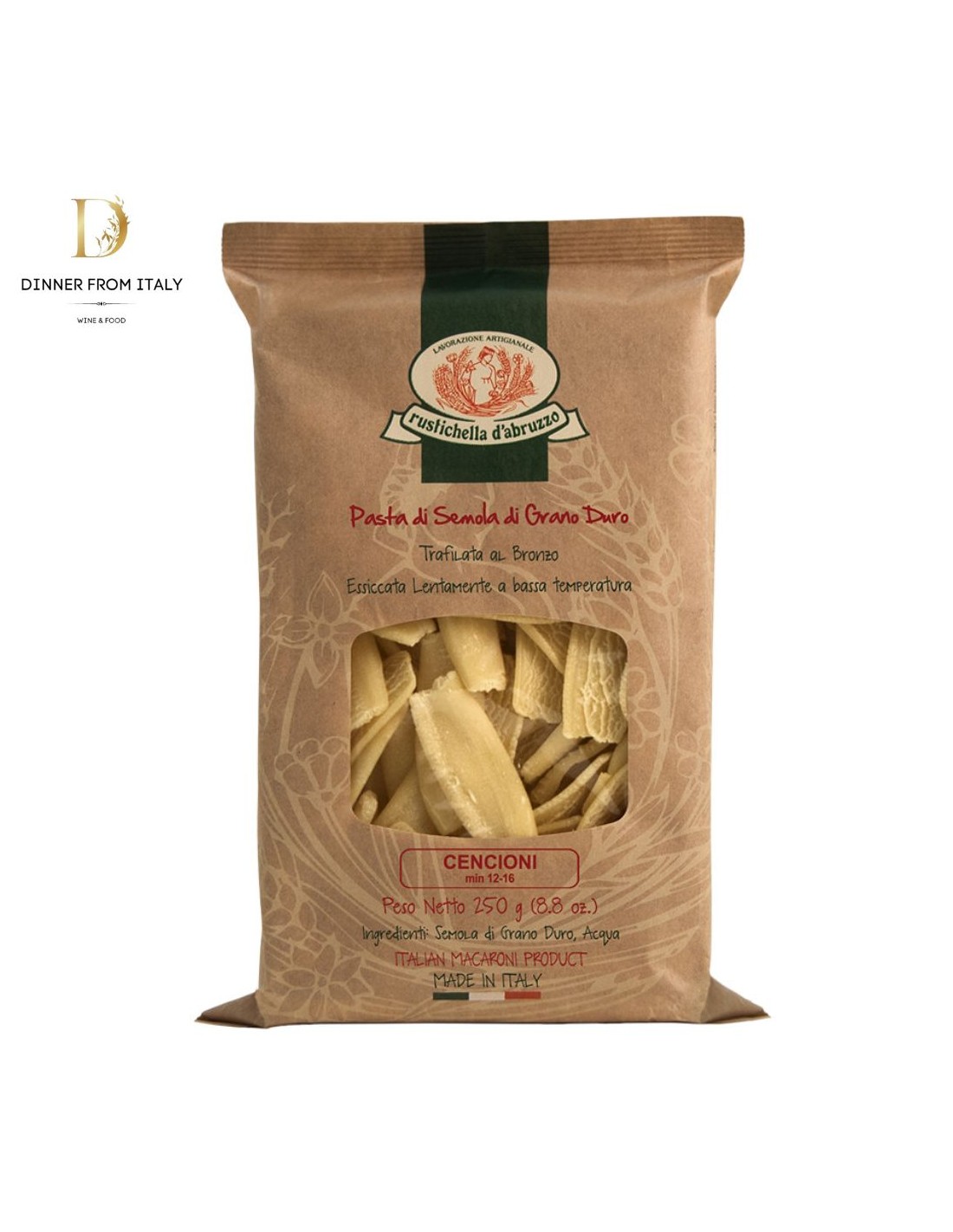 Originario dell centro-sud Italia, questo formato di pasta artigianale dalla forma ovale e leggermente arricciata, trova uso in diverse ricette della tradizione popolare. A Siena per esempio, in occasione del Palio, per il vincitore vengono preparati proprio i Cencioni Rustichella d'Abruzzo su fonduta di pecorino, pomodorini e rucola.