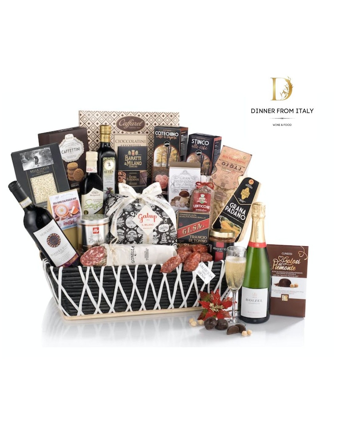 • Cesto in legno con manici • Panettone Classico Milanese - TRE MARIE - 750 g • Champagne Brut Réserve