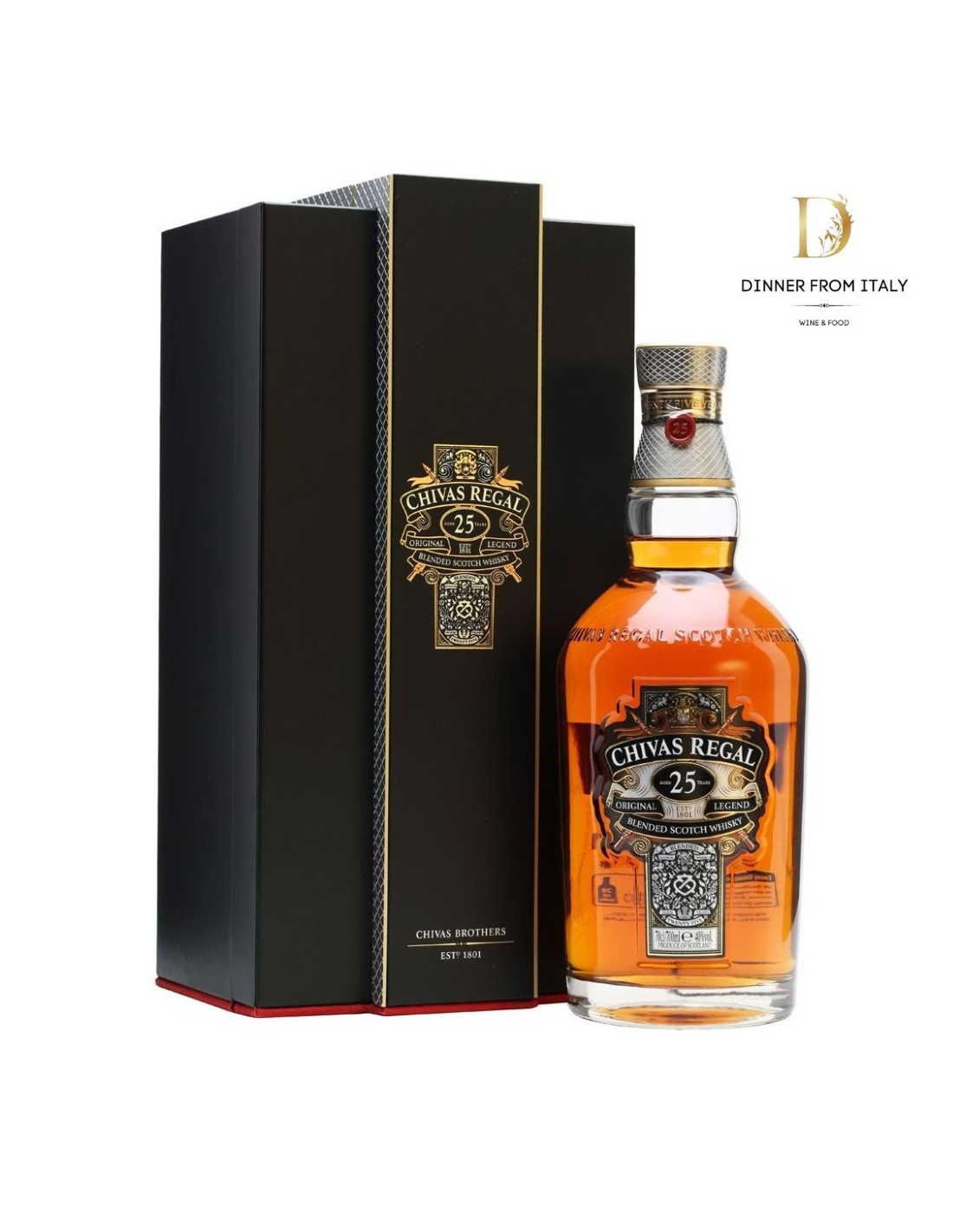 Creato per la prima volta nel 1909, al fine di soddisfare il gusto sofisticato dell'alta società newyorkese che ha acquisito in poco tempo una risonanza internazionale, questo Chivas Regal nasce dall' unione dei migliori whisky scozzesi che invecchiano almeno 25 anni in pregiate botti di rovere, per ottenere un prodotto che è considerato un vero benchmark per la categoria. Ricco, stratificato, dona sensazioni impareggiabili, sia nei profumi che al gusto, espressione concreta di precisione e rigore che i fratelli Chivas hanno sempre impiegato nella ricerca del blend perfetto e nello scegliere le migliori condizioni di invecchiamento.